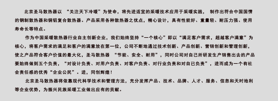 版权所有:北京圣马散热器 联系人:于经理 手 机:13702123976 网 址:http://www.shengmasrq.com 地址:北京市大兴工业园 友情链接:圣马散热器 北京圣马散热器 北京铜铝复合散热器 北京卫浴散热器 北京十大品牌散热器 北京散热器供应商 北京散热器厂家 北京圣马散热器是一家专业生产钢制散热器、铜、钢铝复合散热器、卫浴散热器及异型散热器的生产厂家,欢迎新老客户来电来函,我们竭诚为您服务!